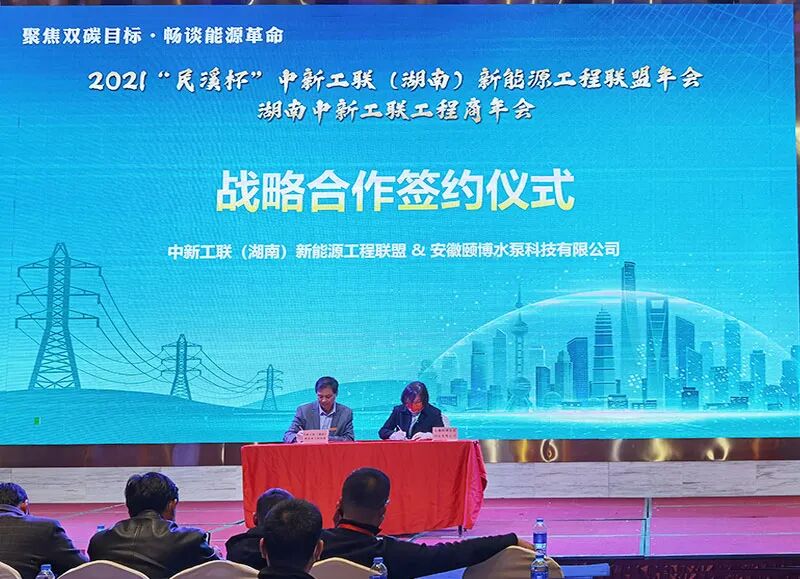 2022年1月6日,安徽颐博水泵科技有限公司应邀参加了2021中新工联(湖南)新能源工程联盟年会,同时双方成功举行了战略合作签约仪式,正式达成战略合作,双方将发挥自身优势,共同打造双赢、可持续发展的战略合作伙伴关系。